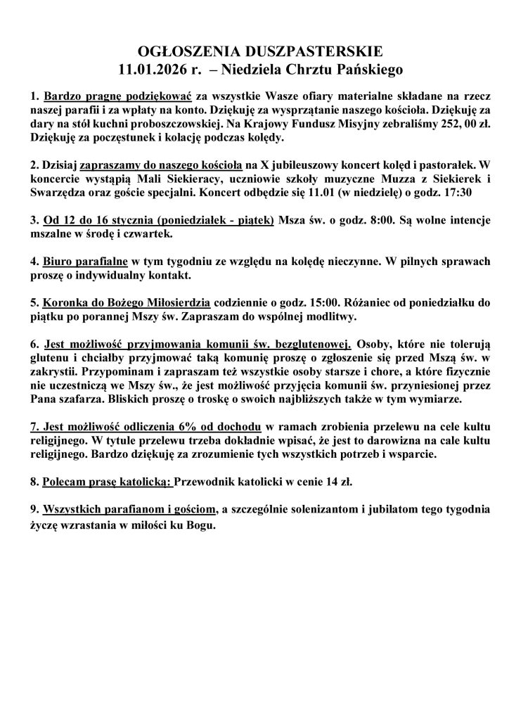 Ogłoszenia Duszpasterskie 11.01.2026 – Niedziela Chrztu Pańskiego