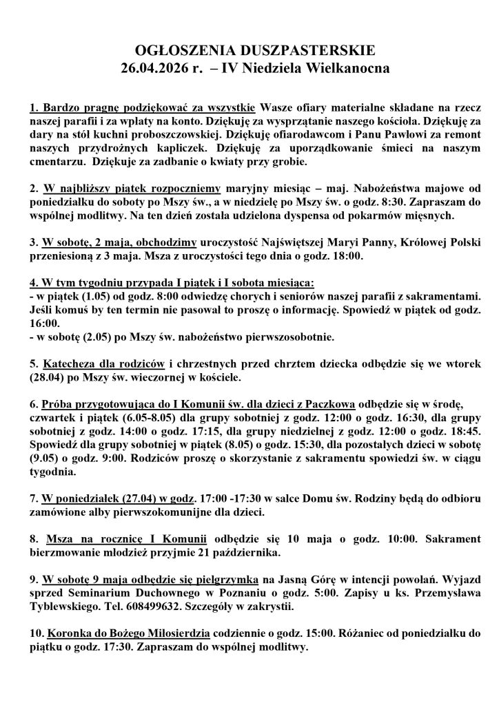 Ogłoszenia Duszpasterskie 26.04.2026 – IV Niedziela Wielkanocna