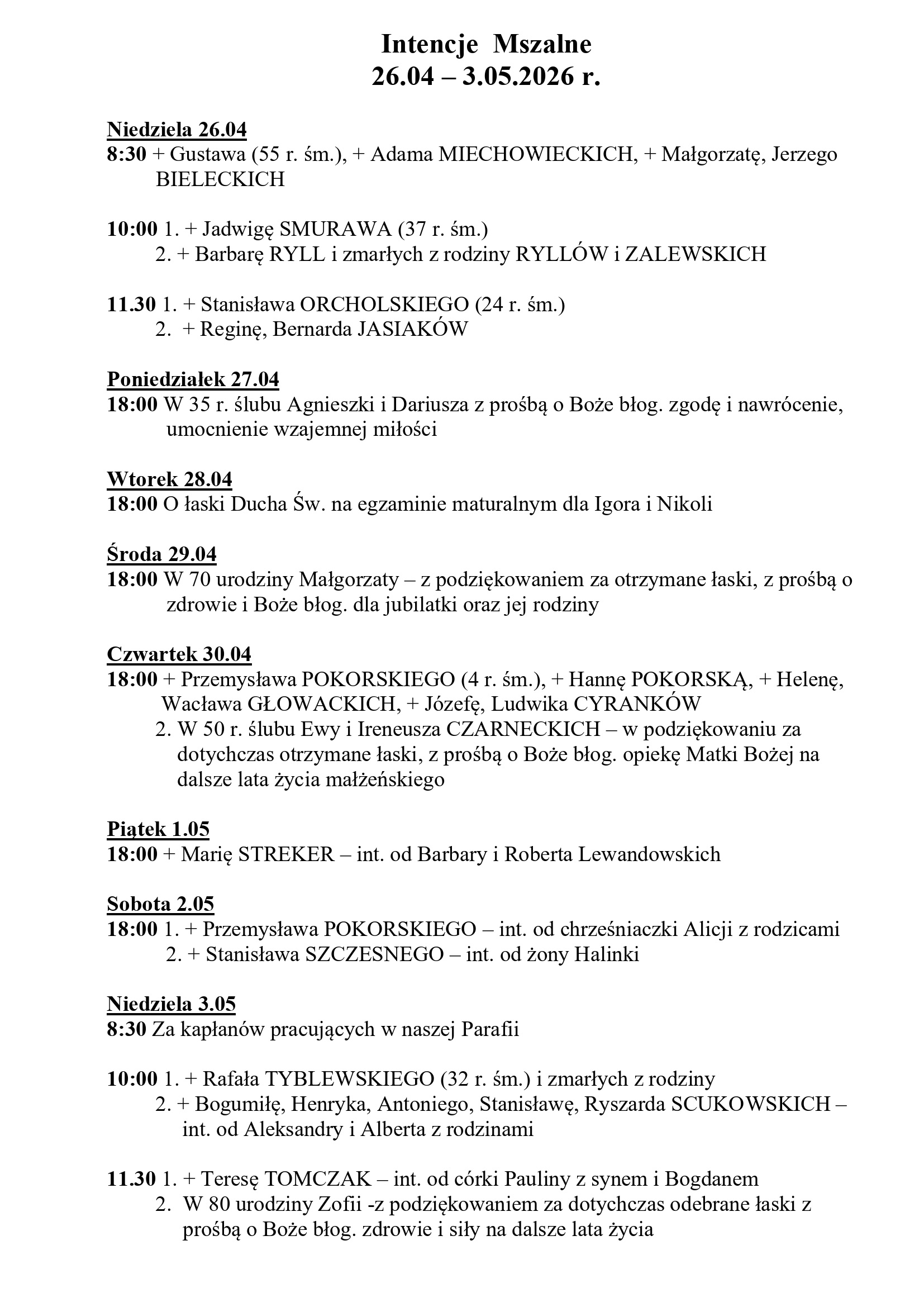 Intencje Mszalne – 26.04 – 03.05